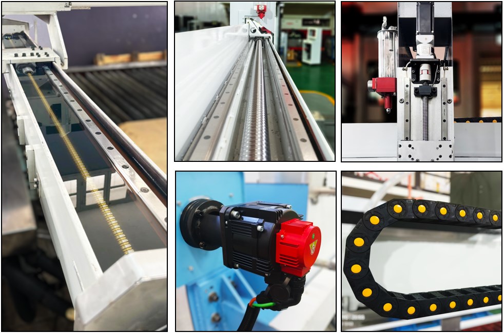 5. Z軸もダブルガイドレールとボールネジ構造を採用し、カッティングヘッドの動作安定性と装置の耐久性を確保します。Z軸は自動高さ調整機能付きサーボモーターです。