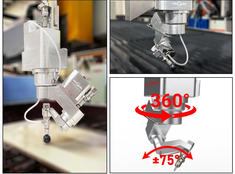 3. C軸は360°回転、A軸は±75°スイング可能です。A軸とC軸は連動し、高いソフトウェア演算精度により、カッティングヘッドの角度に関わらず、切削点は常にボールセンターに位置し、スイング角度精度は±0.01mmを実現しています。